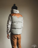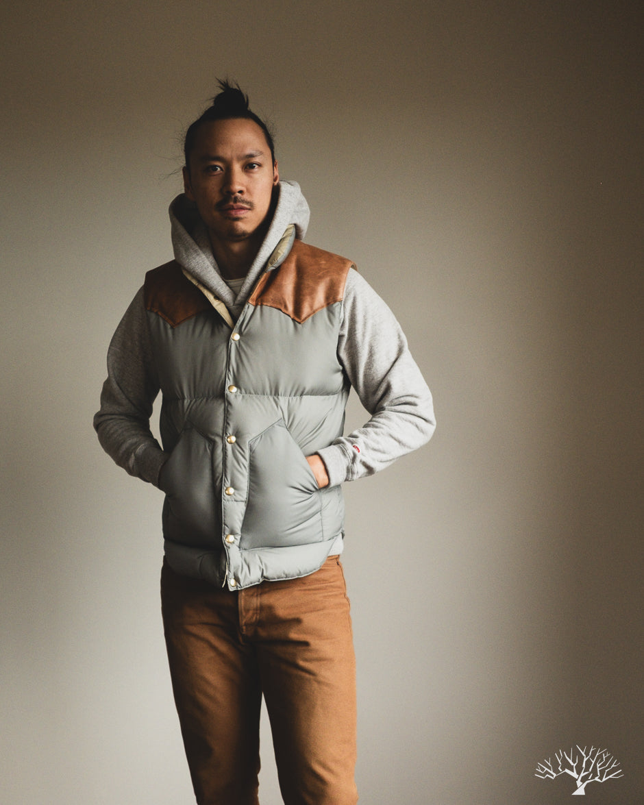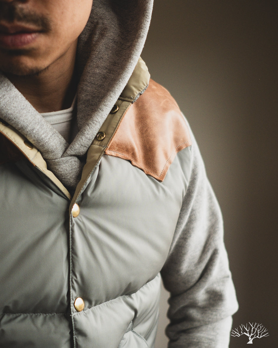 Made each Fall/Winter, the Rocky Mountain Featherbed and Warehouse collaboration comes together to produce a line of lovely down vests that seek to reproduce the originals in details and quality. This Nylon Down Vest in Gray is accented with a natural horse leather yoke for peak detailing and a sot tan nylon interior. These vests will serve you well during the winter as an excellent layer to provide additional warmth and protection from the elements.